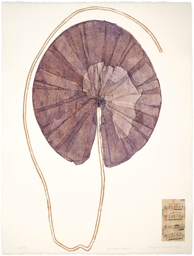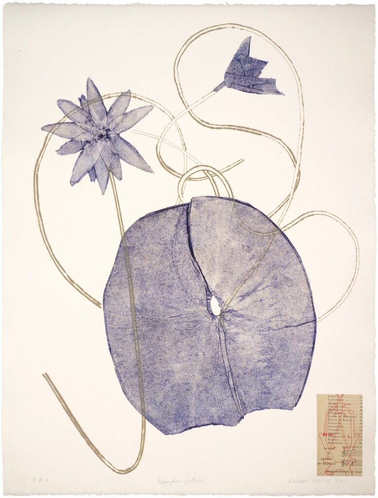 Ses derniers travaux sont en lien avec l’institut de botanique de Montpellier. L’herbier MPU présente une impressionnante collection de plantes. Dans ce vaste monde botanique, son choix s’est porté, dans un premier temps, sur les nymphéas, sur les espèces méditerranéennes menacées et puis plus généralement sur des végétaux « graphiques » dont l’esthétique interpelle.